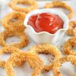 Remove each onion ring from the buttermilk and dip into the flour mixture, then the egg, then the panko, making sure to coat well. Depending on how much you use, you may need more panko bread crumbs. If so, just add a bit more to the bowl.