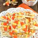 Evenly distribute the candy corn and peanuts on top and gently press them down into the chocolate.