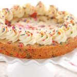 A sugar cookie cake with sprinkles, white chocolate chips, and topped with a homemade vanilla frosting. This Funfetti Sugar Cookie Cake is easy to make and a perfect dessert for any occasion!