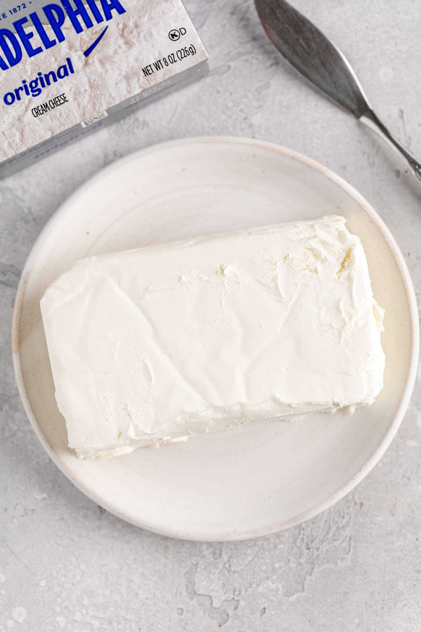 - Remove the cream cheese completely from the wrapper and place it on a microwave-safe plate.