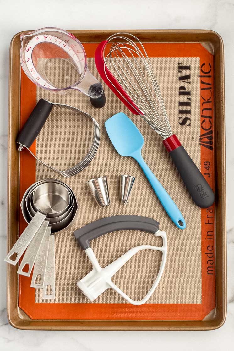 Since I’ve spent a lot of time in my kitchen testing recipes with different baking tools and equipment, I know what works well. So, I’ve decided to compile a list of my favorites! From baking sheets to measuring cups to appliances and more, I’ve covered all of the basics.