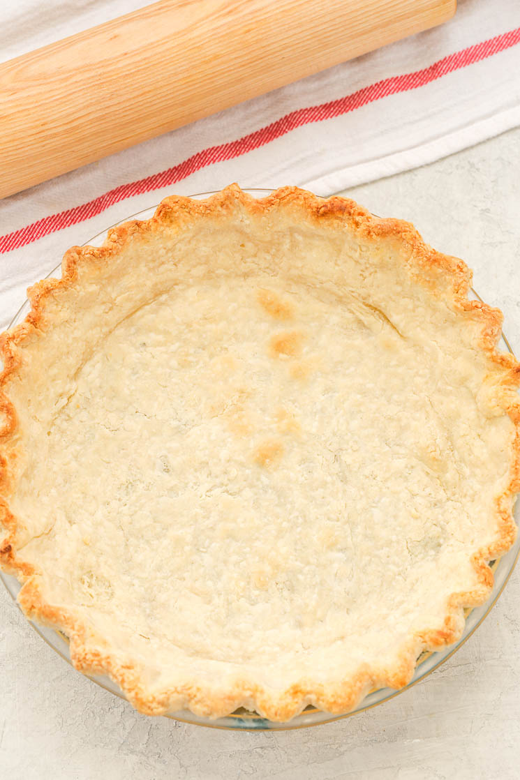 If you’re making a pie with a filling that doesn’t need to be baked, you’ll want to adjust the baking time for the crust after you remove the pie weights from 6-8 minutes to 15-20 minutes, or until the crust is lightly browned and baked all of the way through.