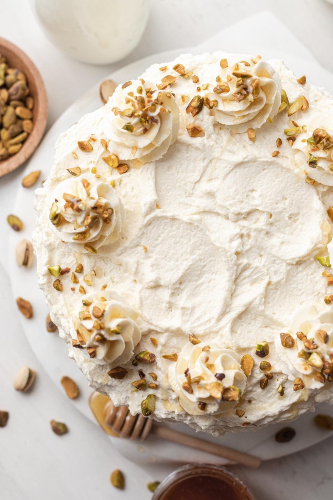 - If adding pistachios and honey on top of the cake, I recommend doing this right before serving. Otherwise, the pistachios will soften and the honey will dissolve into the frosting.