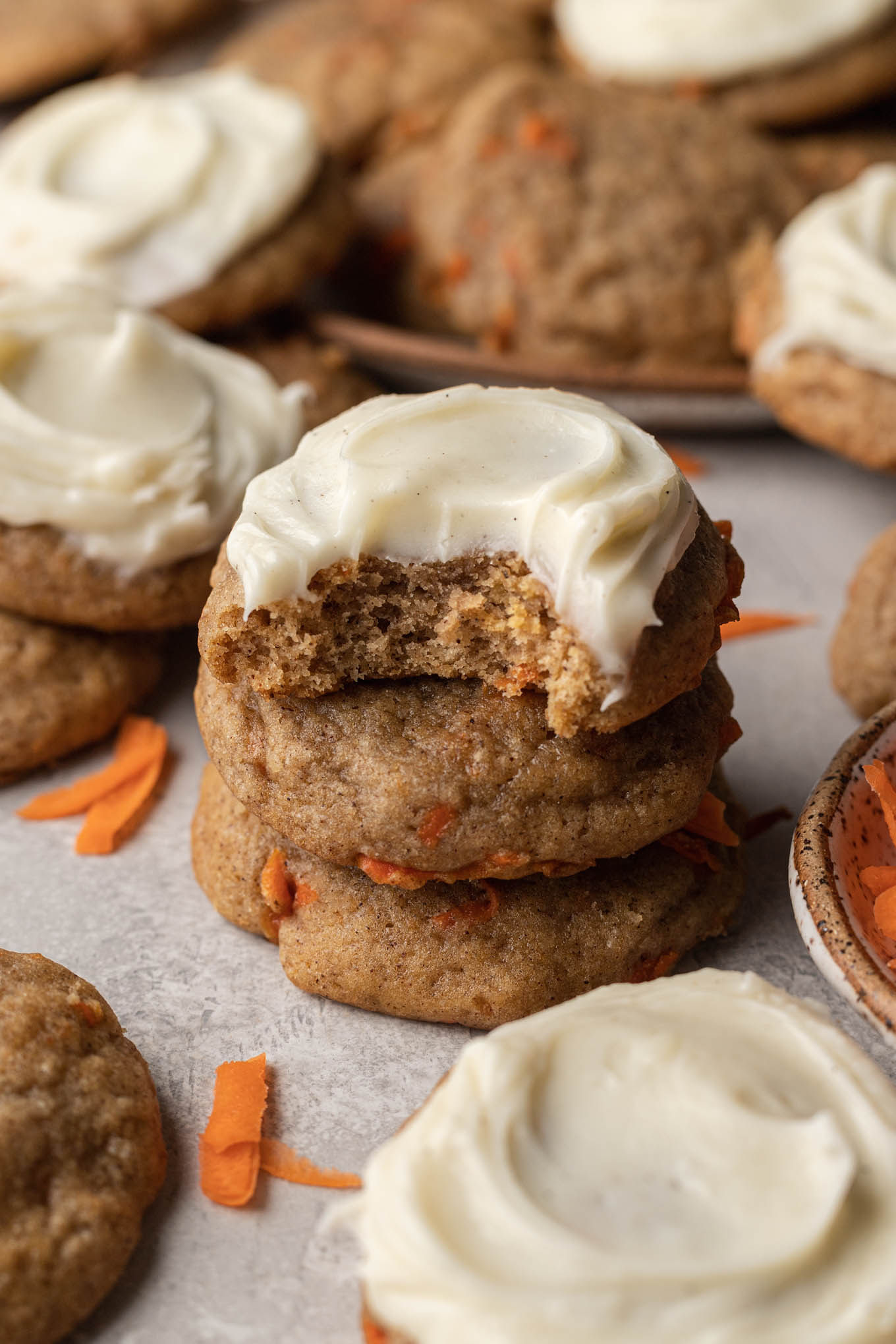 The combination of cinnamon, ginger, nutmeg, and cloves lends the cookies that classic spiced carrot cake flavor, while freshly grated carrots add lots of texture and moisture to the dough.