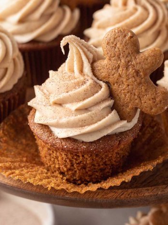 Richly spiced gingerbread cupcakes are topped with brown sugar cinnamon cream cheese frosting in this easy recipe. Garnish with mini gingerbread cookies for a...