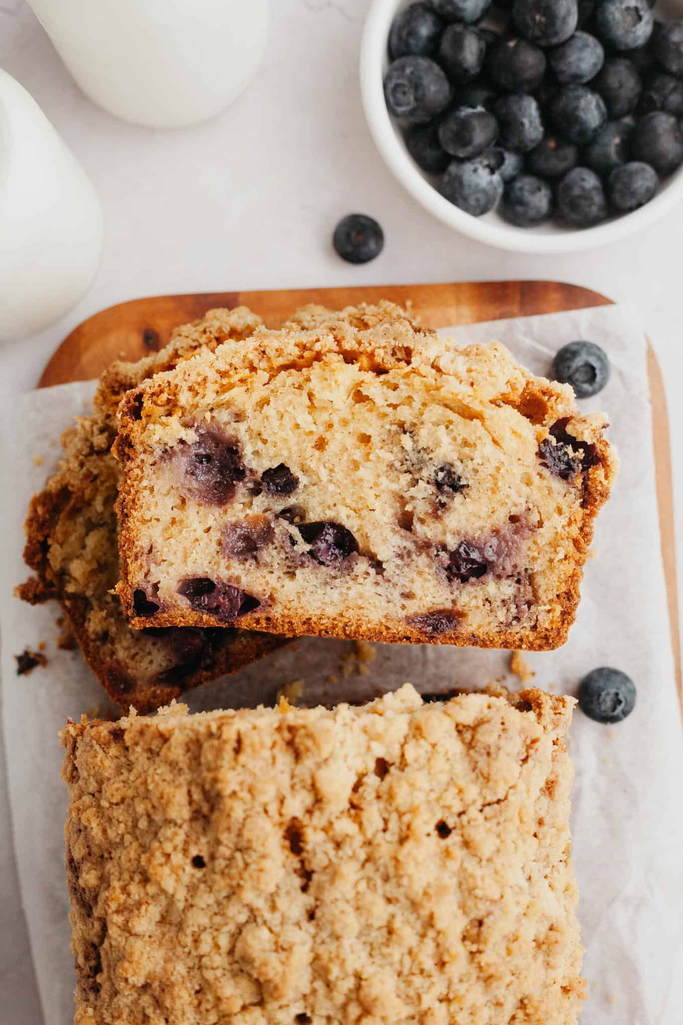 This quick bread recipe is all about the blueberries! It’s reminiscent of blueberry coffee cake and blueberry muffins, but there are no extracts, spices, or citrus zests in the batter to compete with the fresh blueberries.