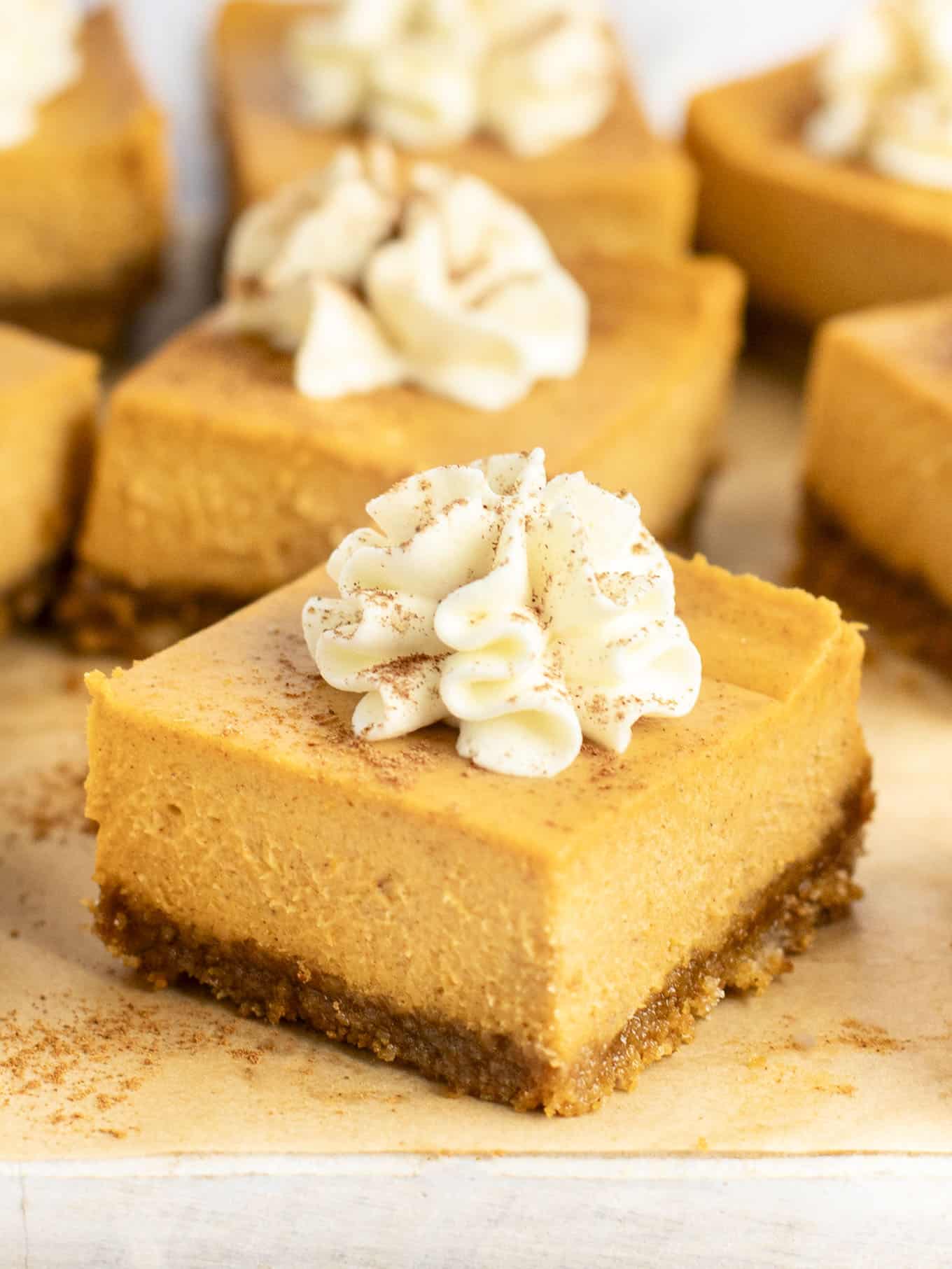 Because these cheesecake bars are so rich, you can easily get 16 servings from a 9-inch baking dish. You can enjoy them as is, but I love to top them with homemade whipped cream and a sprinkle of pumpkin pie spice just before serving.