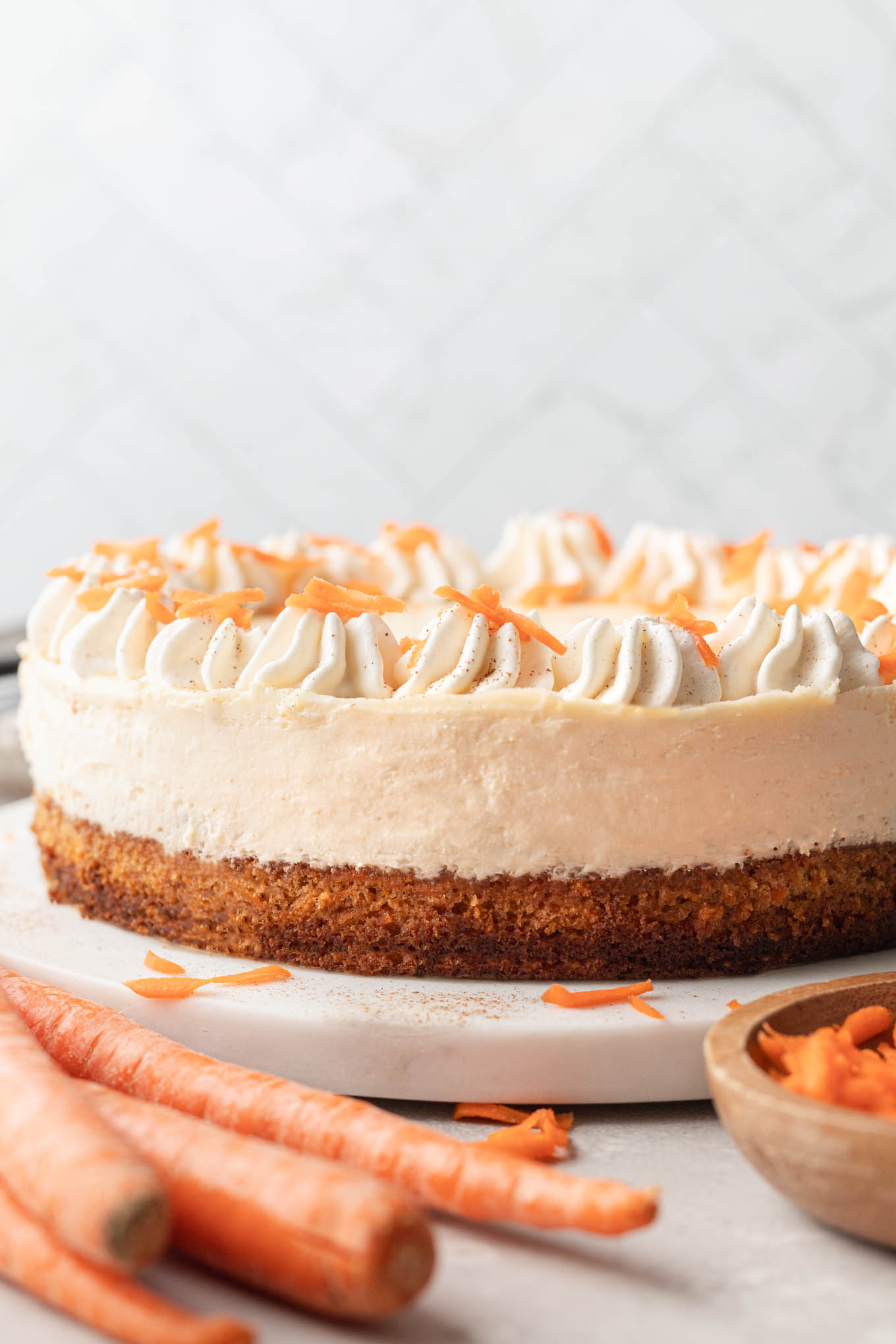 - For a little extra decoration, I topped my cheesecake with whipped cream, ground cinnamon, and some extra grated carrots.