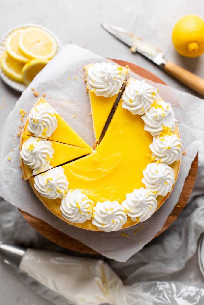 This easy lemon cheesecake features a homemade graham cracker crust and a sweet-tart cheesecake filling, all topped with creamy lemon curd and swirls of whipped cream.