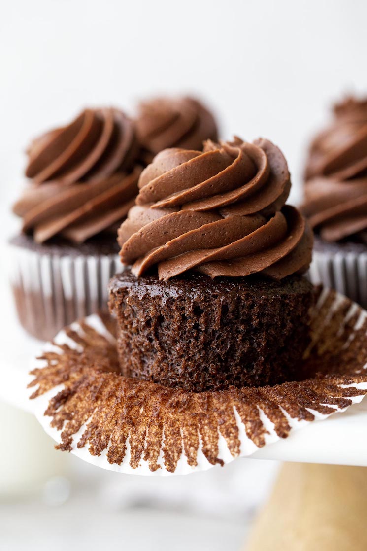 Perfect Chocolate Cupcakes topped with a chocolate buttercream frosting! This chocolate cupcake recipe is easy to make, incredibly soft, light, and moist.