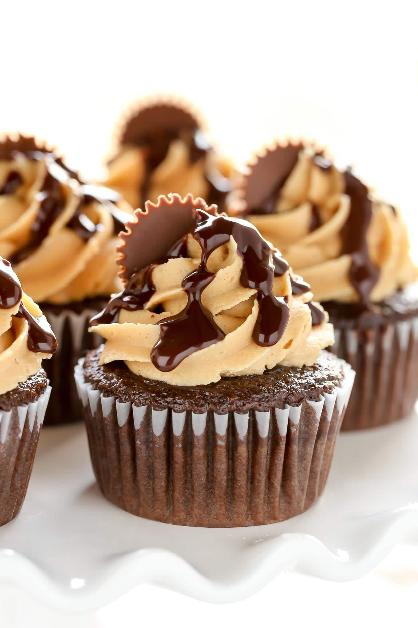 Moist chocolate cupcakes with peanut butter frosting, chocolate ganache, and peanut butter cups. These cupcakes are the ultimate chocolate and peanut butter dessert!