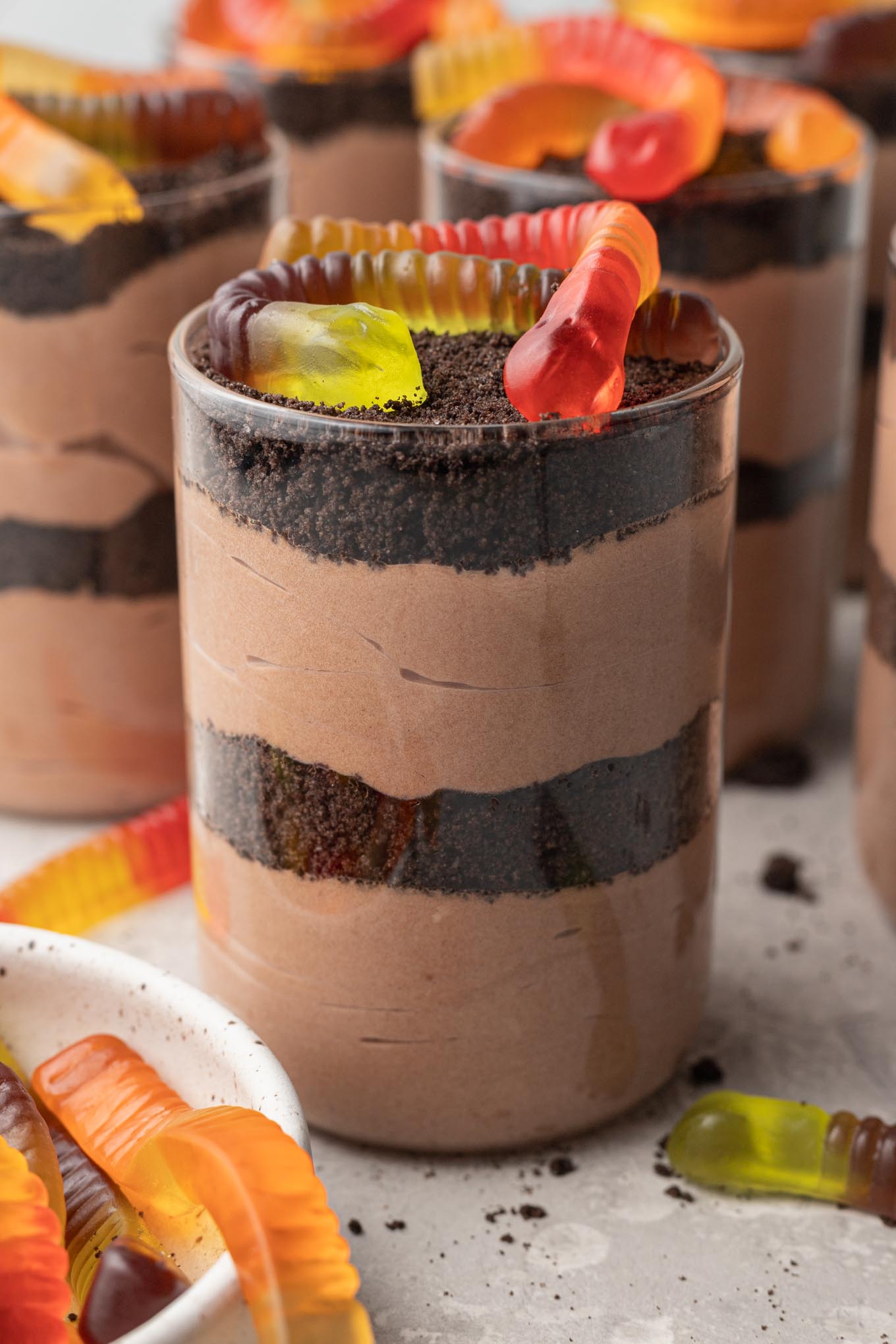 - Place two to three gummy worms on top of each cup right before serving.