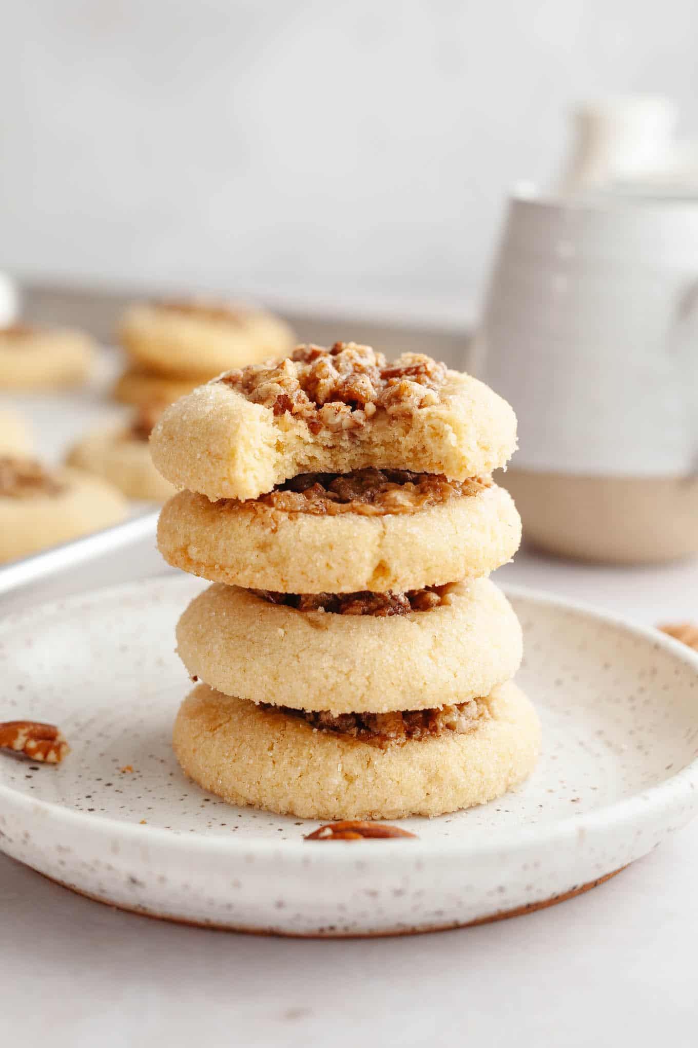 - Be careful not to overfill the thumbprints. If you add too much, the pecan pie filling may ooze out of the cookies as they bake. I find that a little over 1 teaspoon is the perfect amount for each one!