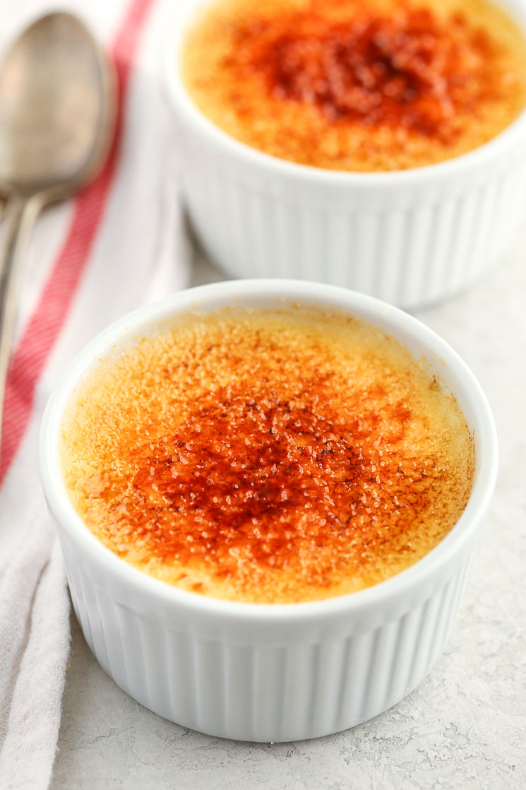 Once they’re done, let them cool at room temperature, then refrigerate them for at least 4 hours or overnight. Once they’re thoroughly chilled, you’ll top each one with some granulated sugar (superfine sugar works great if you have it on hand!) and use a small kitchen torch to caramelize the sugar.