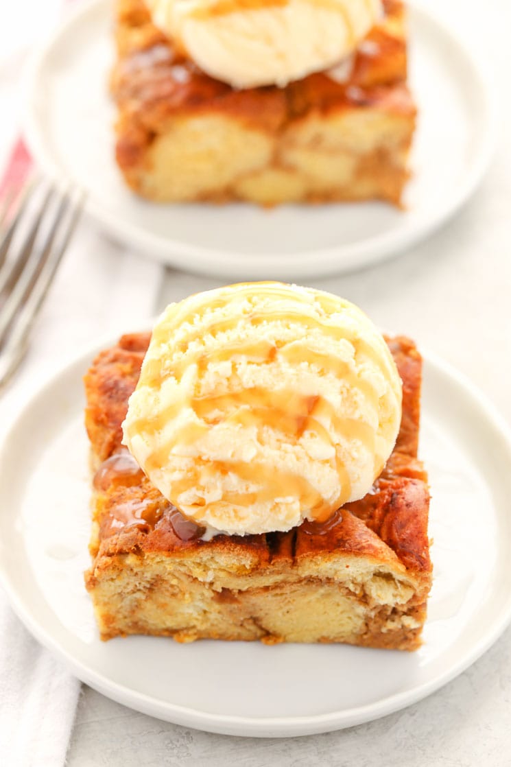 Once the challah bread pudding is finished baking, set it aside to cool slightly on a wire rack. You can enjoy this bread pudding plain or serve it with a huge scoop of ice cream and some homemade salted caramel sauce (my personal favorite!).