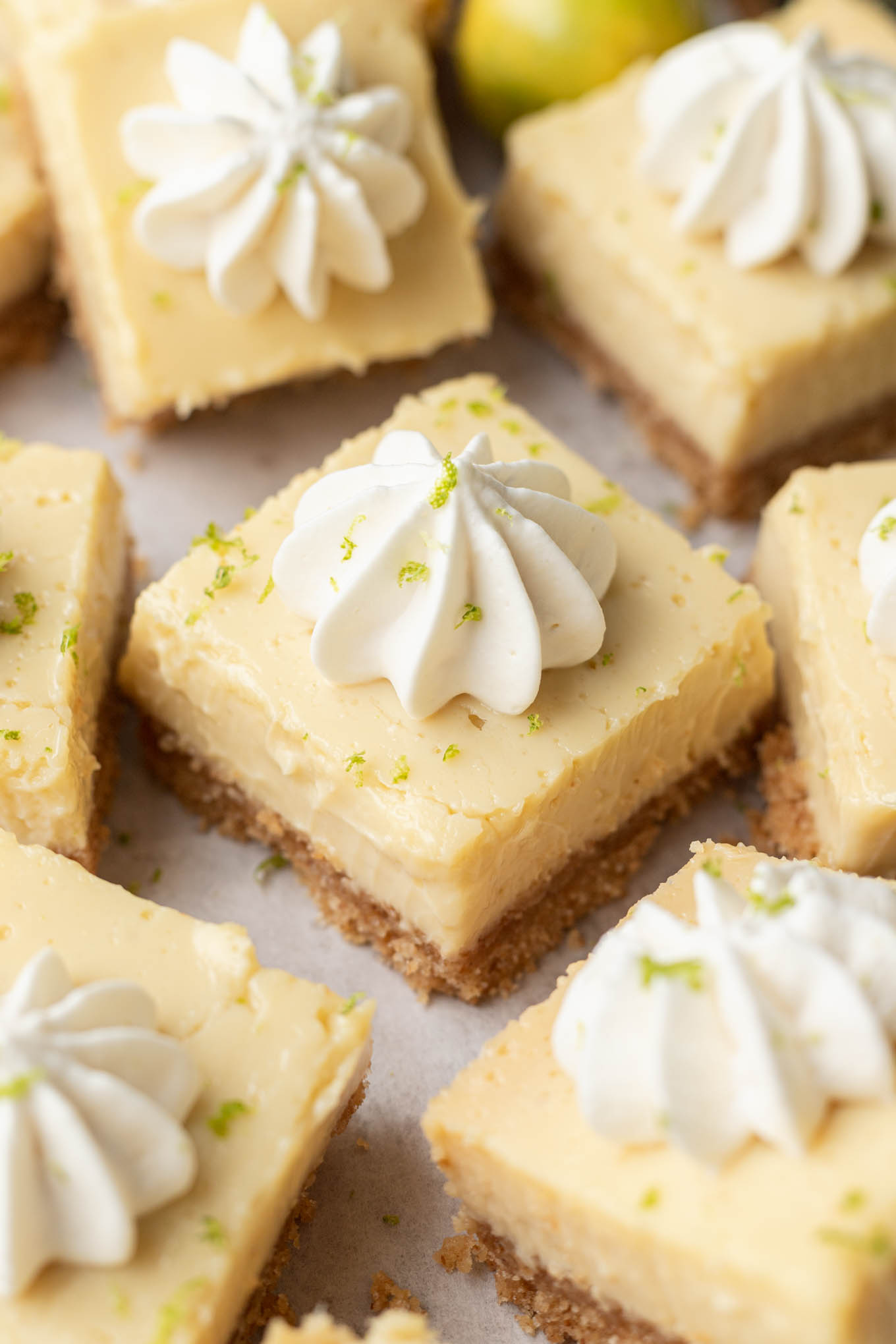 These Key Lime Bars taste like the classic pie, but in bar form! The filling is extra creamy thanks to the addition of cream cheese, and a dollop of whipped cream on top is the perfect finishing touch.