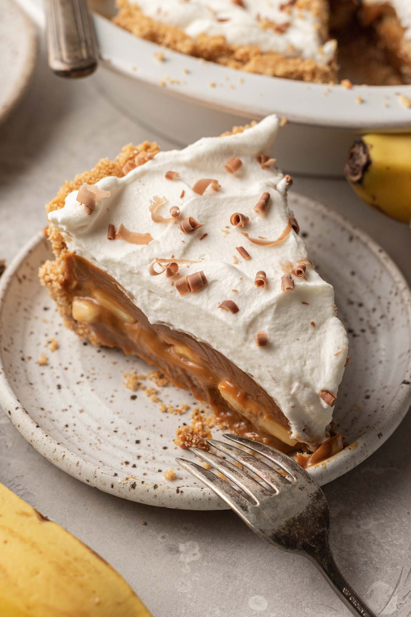 A buttery graham cracker crust is filled with dulce de leche and sliced bananas, then topped with homemade whipped cream to create an irresistible banoffee pie!