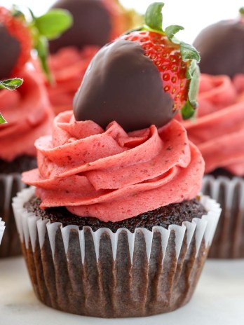 Moist chocolate cupcakes topped with a strawberry buttercream frosting and chocolate covered strawberries! These Chocolate Covered Strawberry Cupcakes are the ultimate Valentine’s Day dessert. *Recipe and...