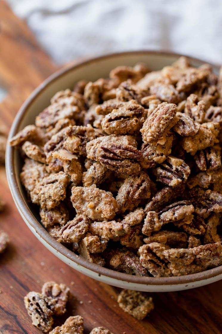 You can store them in an airtight container at room temperature for up to one week. While it’s not necessary to store candied pecans in the refrigerator, if you need to store them longer than one week, then I recommend refrigerating them.
