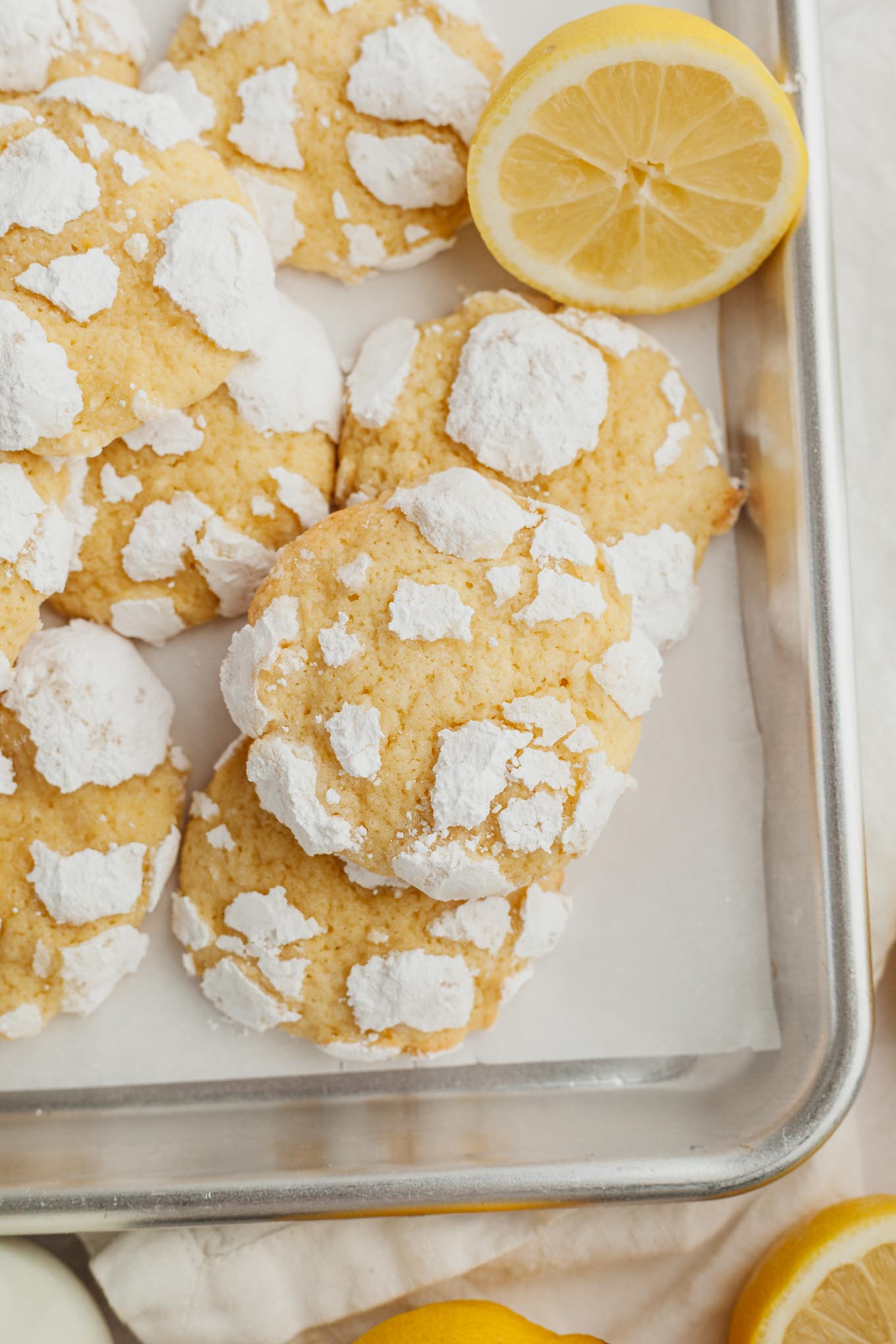 - Granulated Sugar: Sweetens the cookies without competing with the lemon flavor. The cookies are also coated in granulated sugar before being rolled in powdered sugar. This helps the powdered sugar stick and keeps it from melting back into the cookie dough.