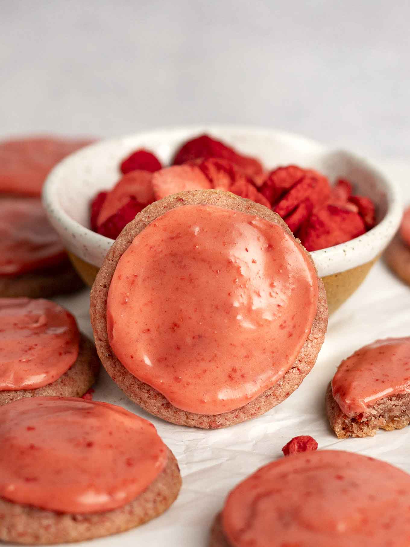 Using freeze-dried strawberries lets us skip the reduction process and infuses these cookies with a more concentrated strawberry flavor (I used this trick in my strawberry pound cake recipe). For even more flavor, I also topped the cookies with a simple strawberry icing.