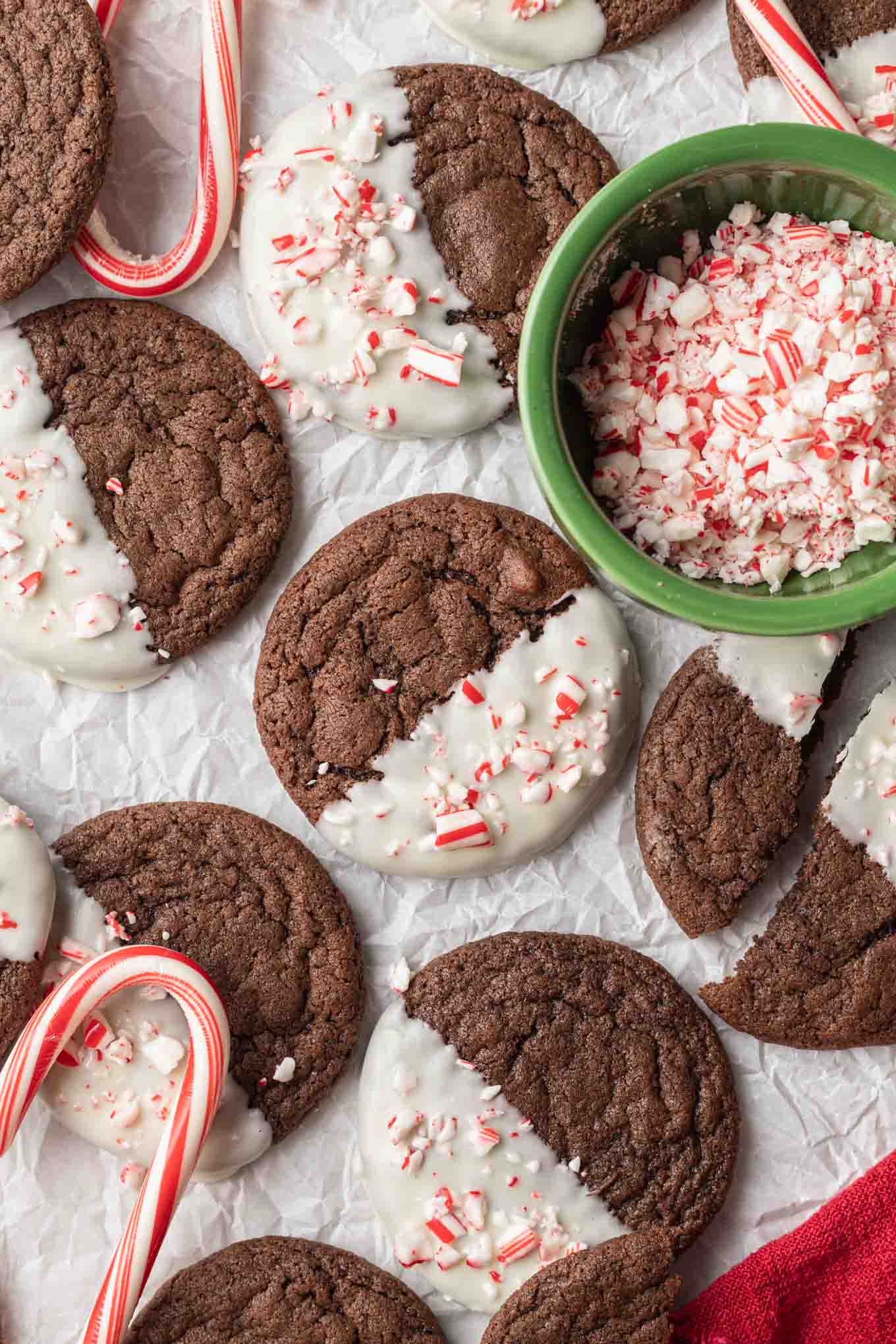 Soft and chewy chocolate peppermint cookies are dipped in white chocolate and sprinkled with crushed candy canes for an extra festive presentation. The cookie dough is also flavored with peppermint extract for twice the peppermint flavor!