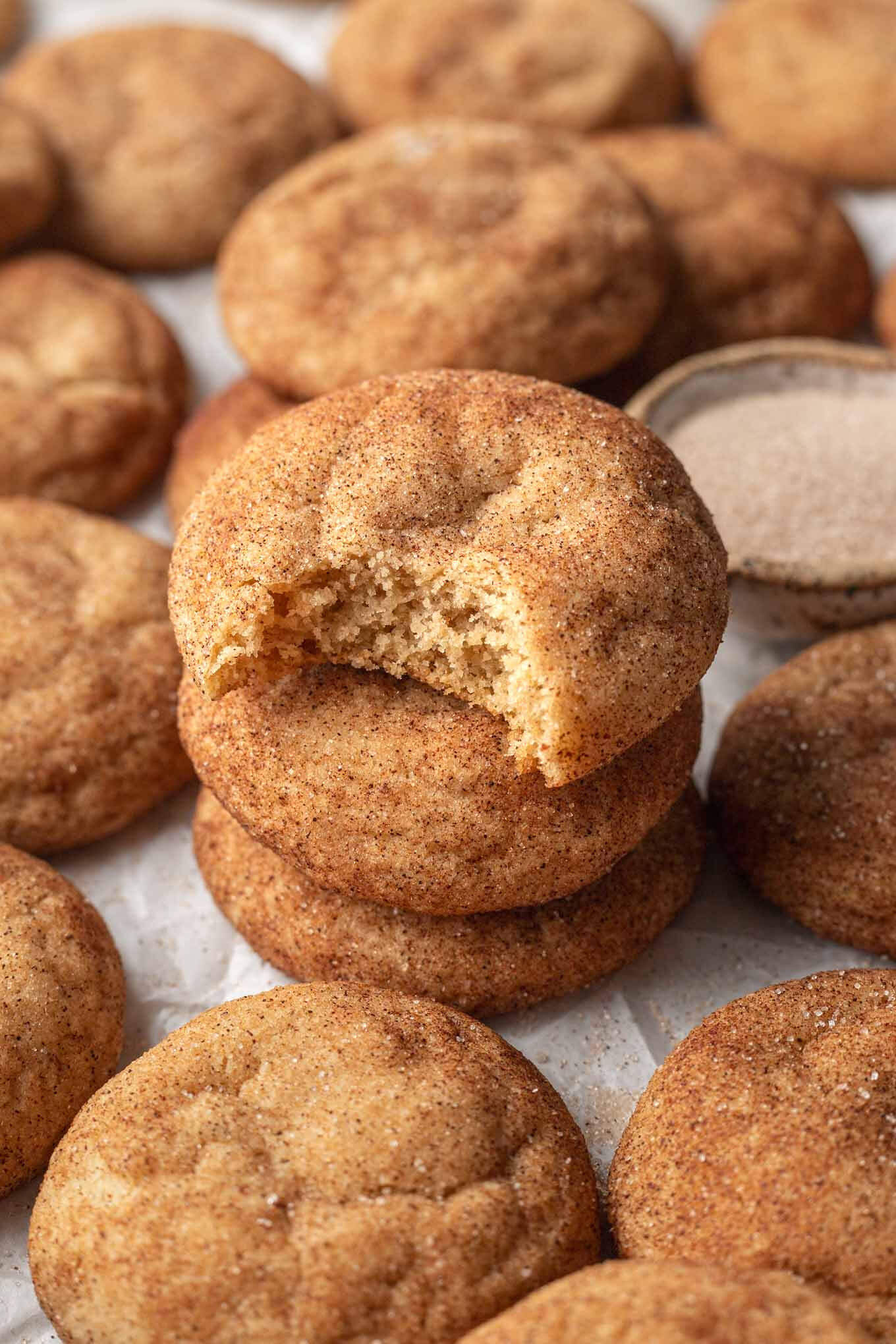 - Cream of tartar: This provides that classic “tangy” flavor we all know and love in snickerdoodles. It’s also a dry acidic ingredient that reacts with the baking soda to help provide some lift in the cookies.