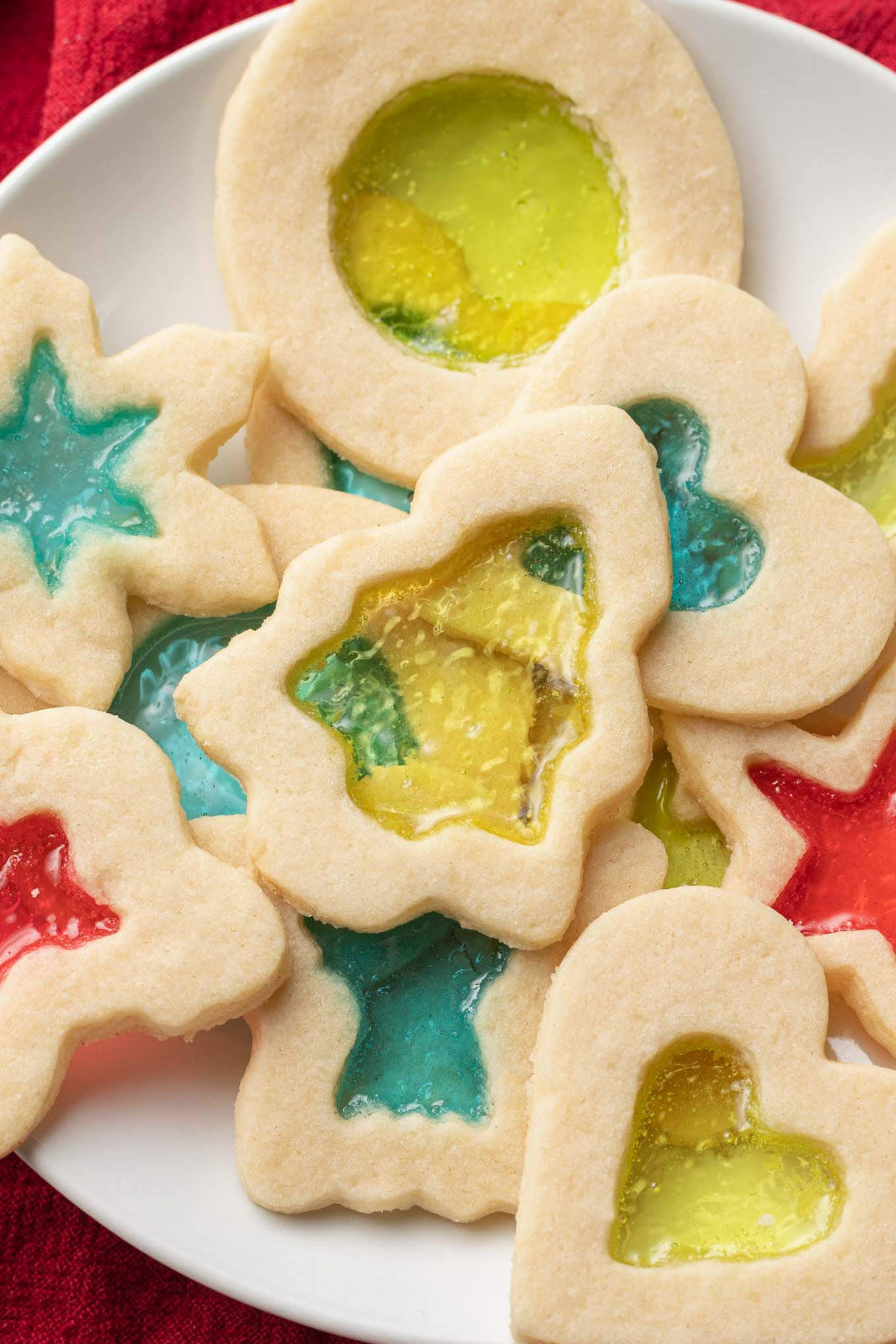 Stained glass window cookies are some of the prettiest cookies you can bake around the holidays. To make them, homemade sugar cookie dough is rolled out and cut into your favorite shapes, then the hole in the middle is filled with crushed Jolly Ranchers before being baked.