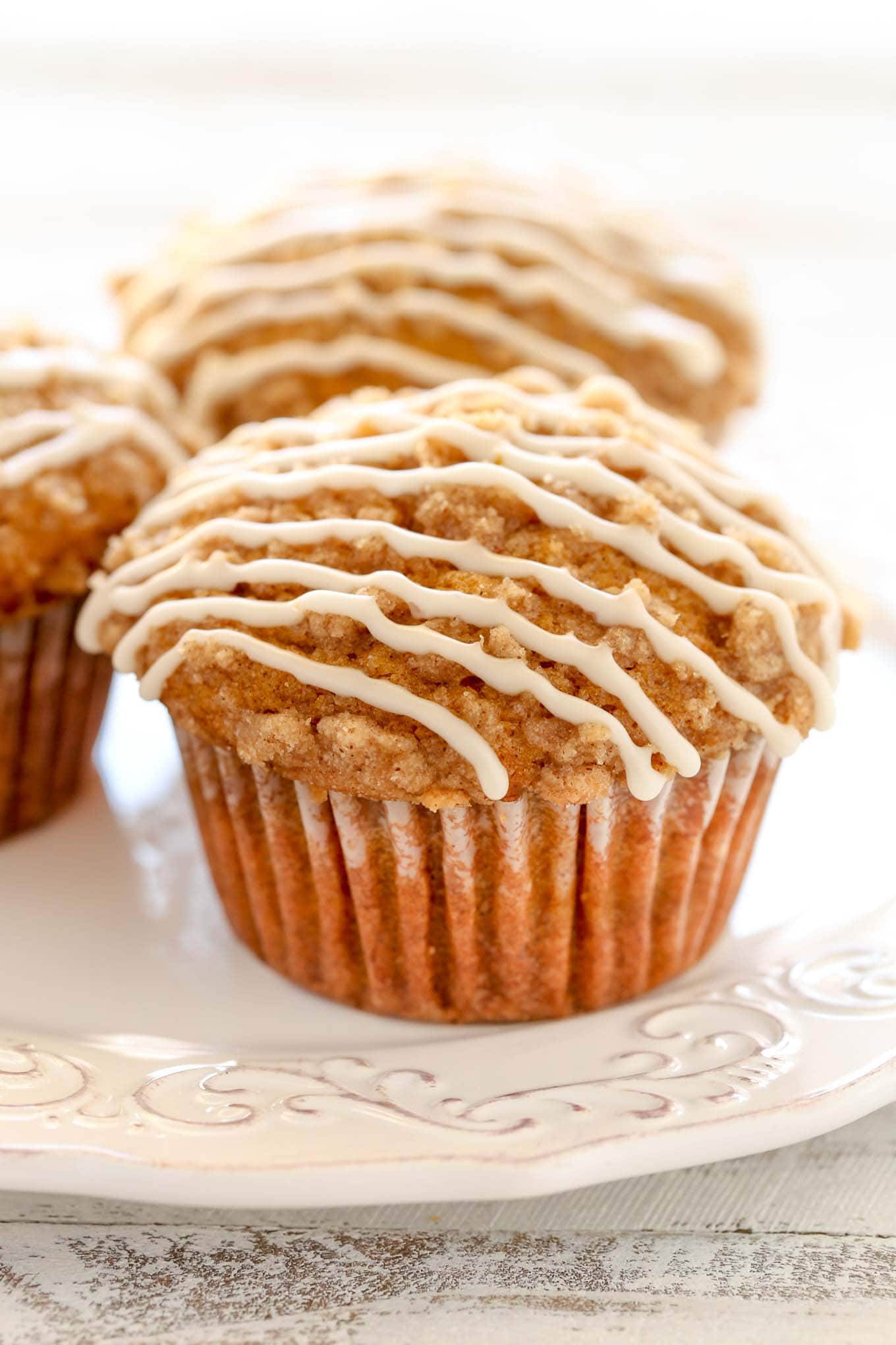 An easy soft pumpkin muffin recipe with a crumb topping and vanilla glaze. These pumpkin crumb muffins are perfect for a fall breakfast or dessert!
