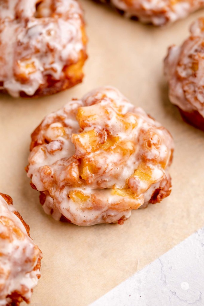 I recommend using up all the glaze, even if it seems like a lot. It will keep the dough moist and it also adds sweetness, since fritter dough itself isn’t too sweet.