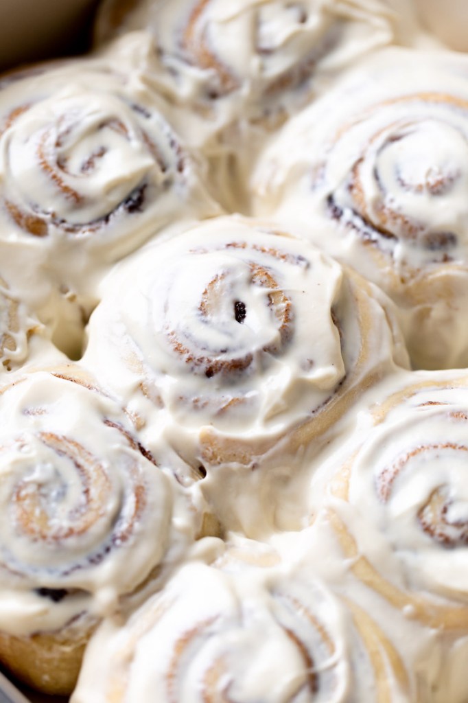 - Once the cinnamon rolls have cooled slightly, frost them, serve and enjoy!