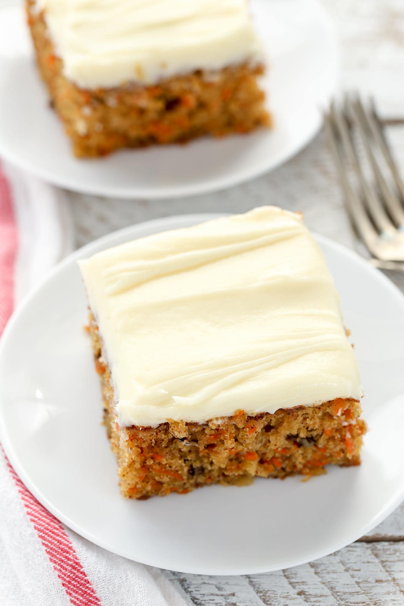 - Using a knife or an offset spatula, top the cooled carrot cake with the cream cheese frosting. Slice into pieces, serve, and enjoy!