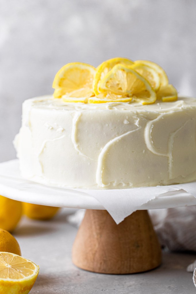 For the lemon cake frosting, I used my homemade cream cheese frosting but scaled it up and swapped out the vanilla extract for fresh lemon juice. I suggest starting with 1 tablespoon of lemon juice in the frosting, then adding more if desired.