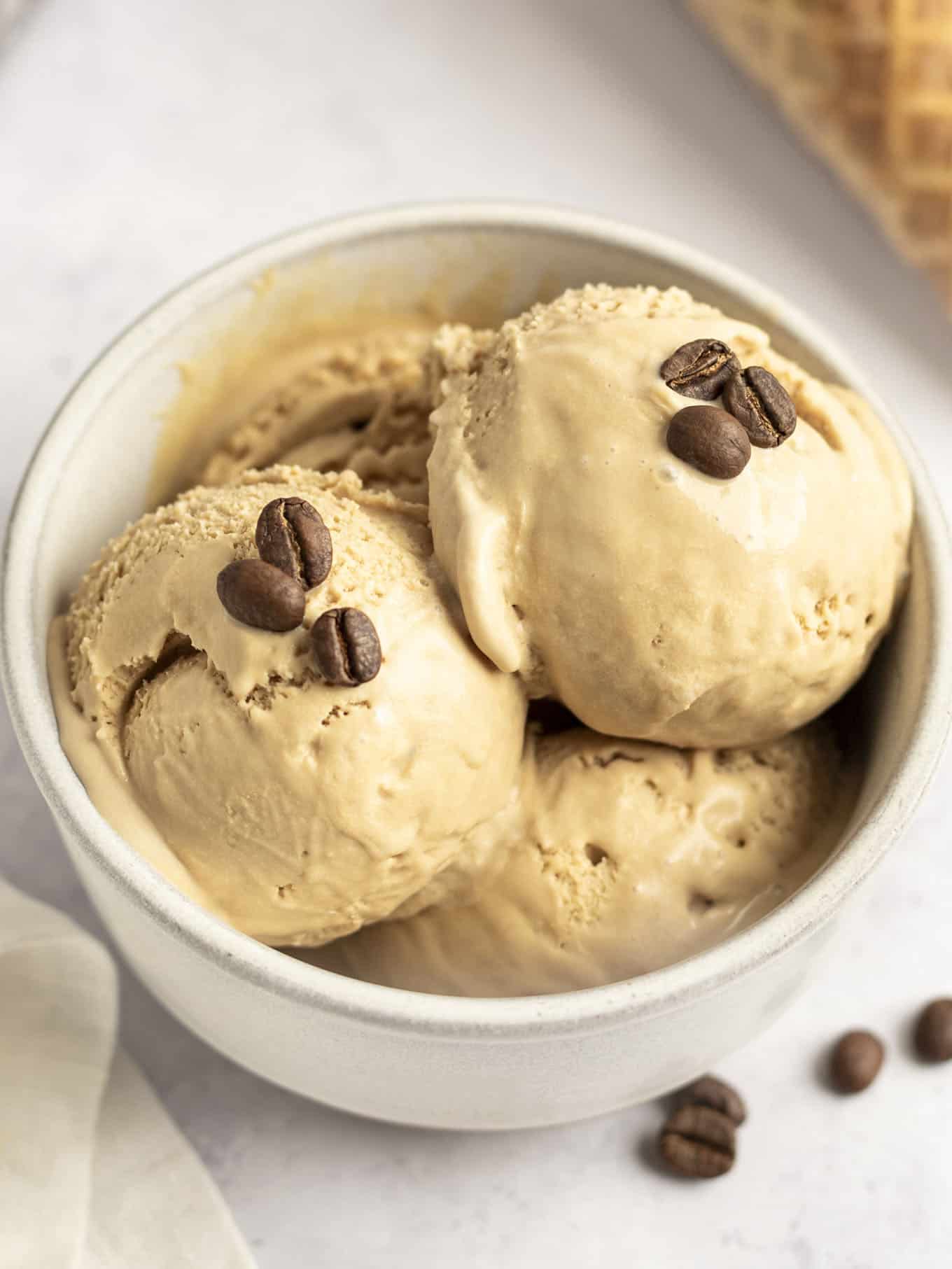 This ice cream would be delicious scooped into waffle cones, or served in a bowl topped with hot fudge sauce or chocolate magic shell for a mocha-flavored frozen treat. It would even be fantastic in my homemade ice cream cake!