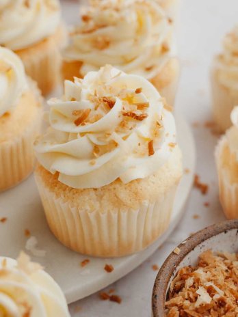 Soft and fluffy coconut cupcakes are flavored with coconut three ways and topped with a creamy coconut buttercream frosting. Top them with toasted coconut...