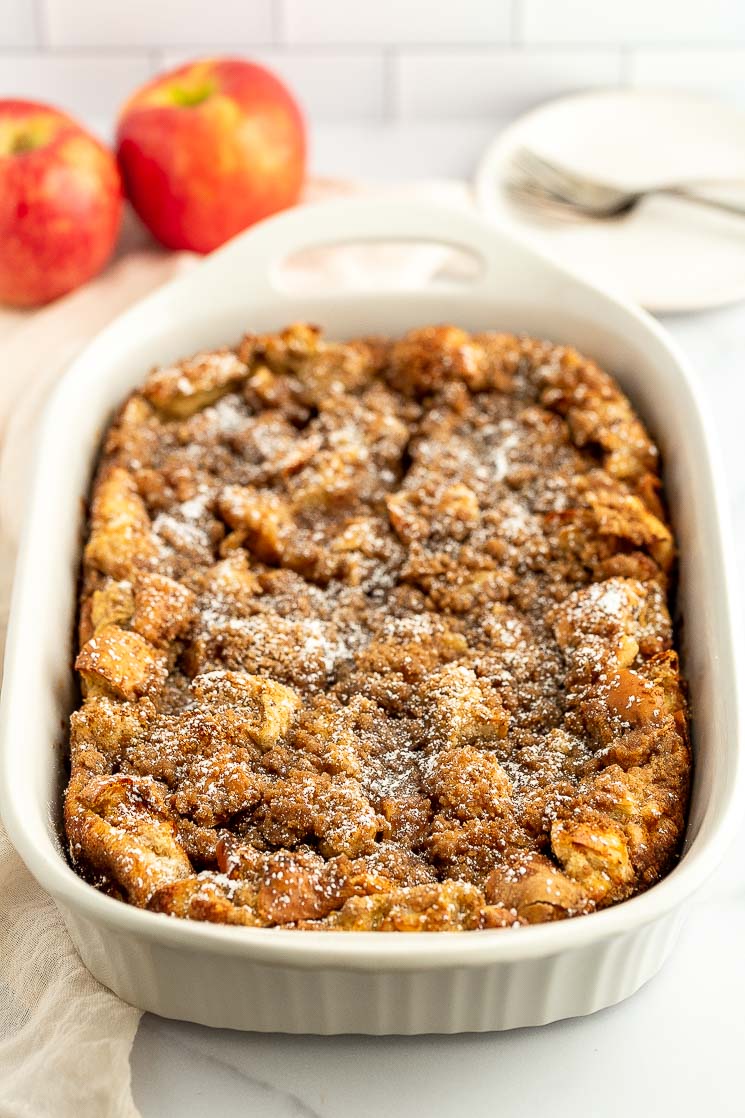 This Apple French Toast Casserole is filled with fresh apples, topped with an easy streusel, and can be prepared ahead of time and refrigerated overnight. Perfect for an easy fall breakfast!