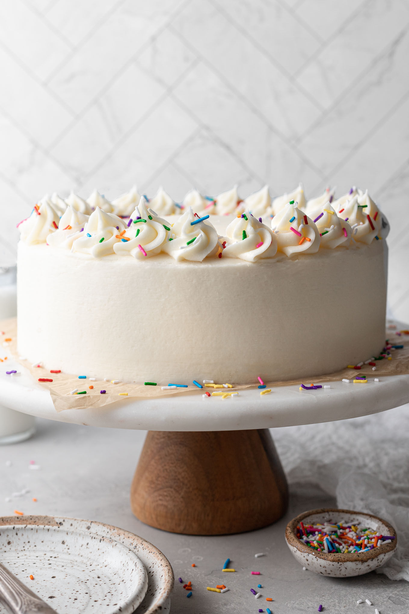 This is a simple white cake recipe topped with my favorite vanilla buttercream. But don’t let the word “simple” fool you — there’s still plenty of flavor in this cake!