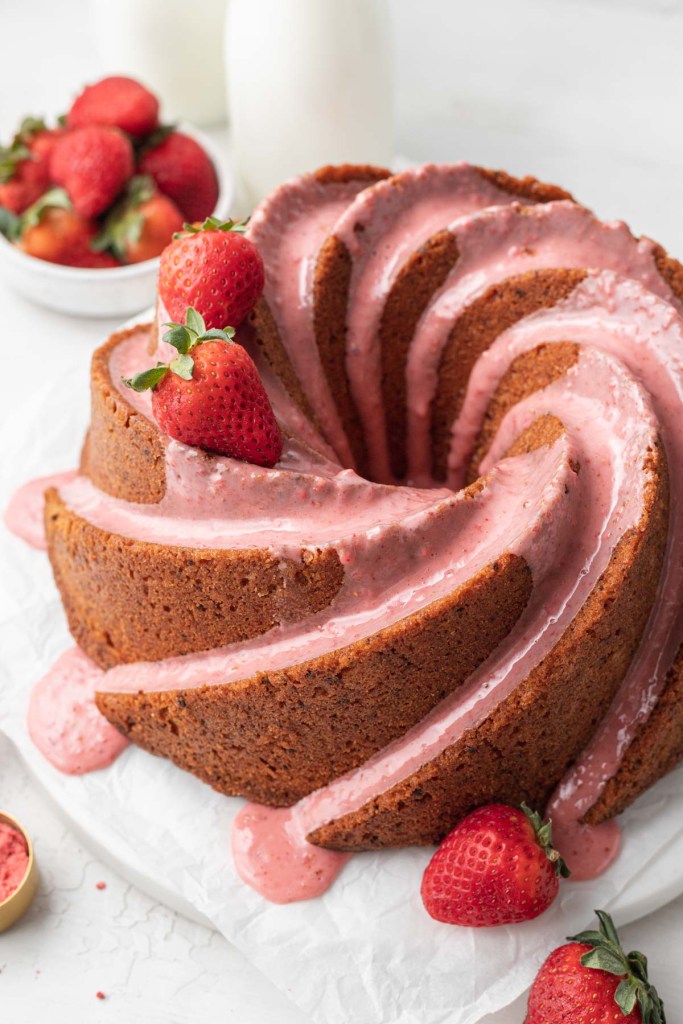 This strawberry pound cake is a simple yet elegant dessert! It’s topped with a three-ingredient strawberry glaze that takes the berry flavor of this dessert over the top.