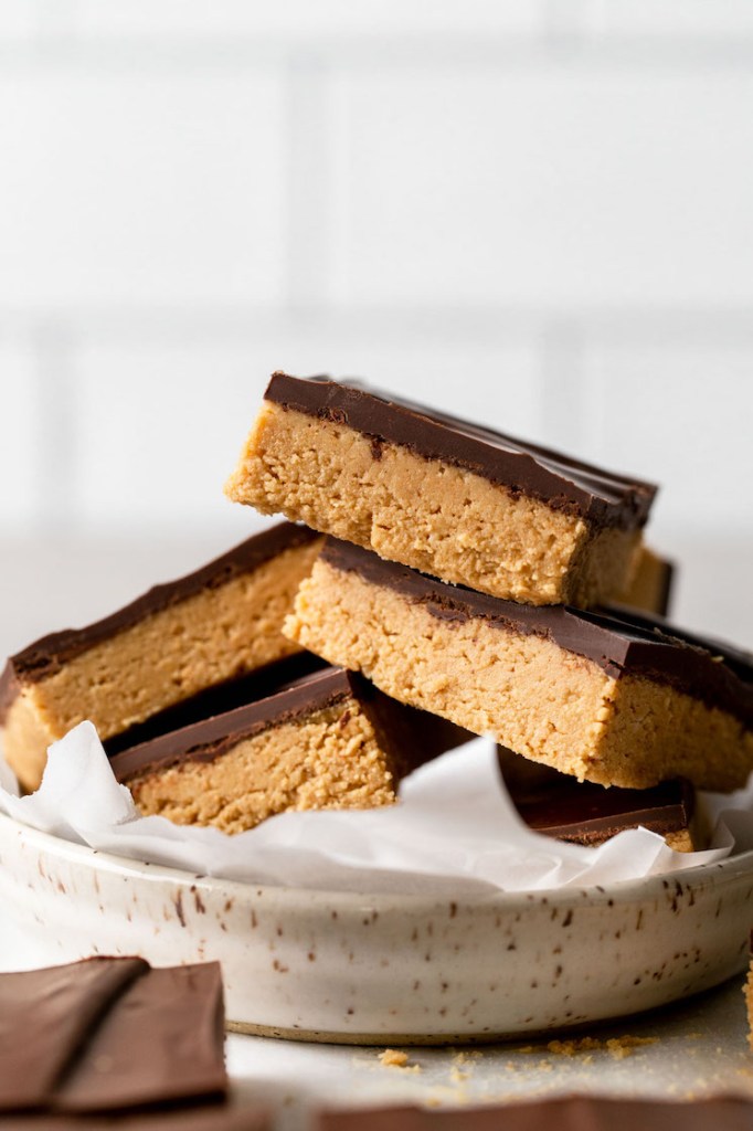 - Powdered sugar: Helps sweeten the bars without giving them a grainy texture. The powdered sugar also helps the peanut butter layer set up in the fridge.