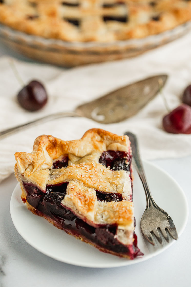 - I used dark sweet cherries for the filling in this pie. If you prefer to use tart cherries, then you’ll want to increase the sugar by 1/4-1/3 cup (depending on your preference).