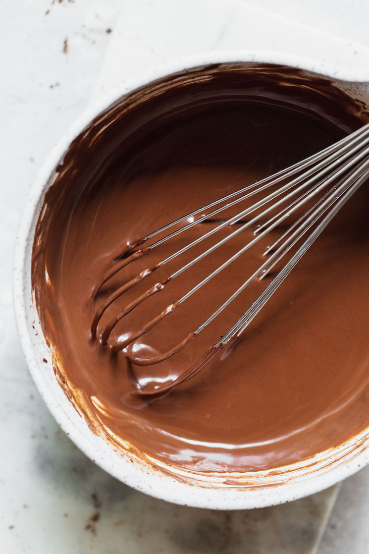Then, pour the warm heavy cream on top of the chopped chocolate and let it sit for 2 to 3 minutes. Once the chocolate has softened, use a whisk or spoon to stir the chocolate and cream together. It’s best so start stirring in the middle and continue stirring in one direction until the chocolate is completely melted and the mixture is smooth.