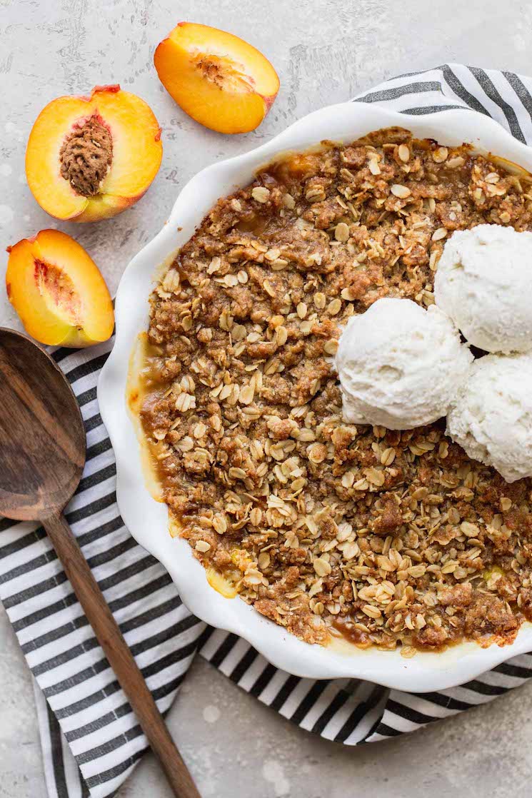 I prefer to just reheat individual servings in the microwave for about 30 seconds or until it’s heated through. If you want to reheat the full dish, preheat the oven to 300°F (150°C), allow the peach crisp to sit at room temperature for 15 to 20 minutes while the oven is preheating, then let it bake in the oven for 15 to 20 minutes or until warmed through.