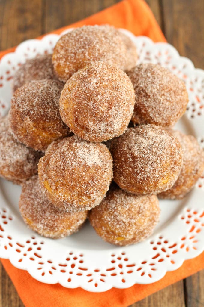 Baked pumpkin donut holes coated with cinnamon and sugar. These make the perfect breakfast for fall!
