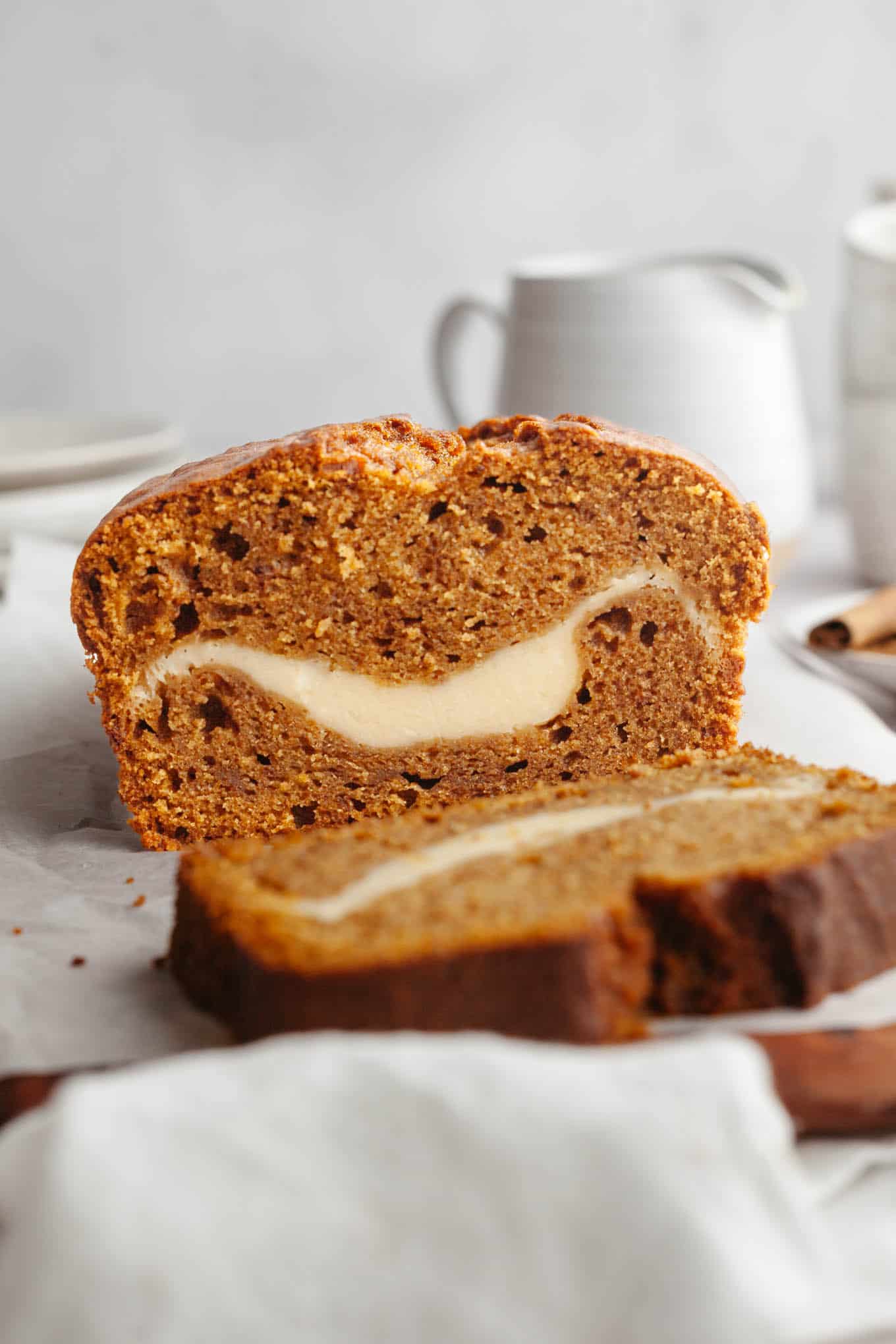After the bread has been baked and cooled, the cream cheese filling has a similar taste and texture to cheesecake. The tangy cream cheese filling and spiced pumpkin bread complement each other so well that I guarantee you’ll want to cut yourself a second slice!