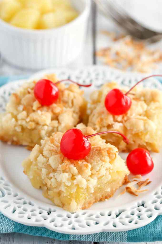 I never used to like pineapple in desserts (or cooked pineapple), but now I love it! I’m still not a fan of coconut though, but I think I would still try these bars, sans the coconut. I love the crumb topping and cherries on top! So cute, Danielle!