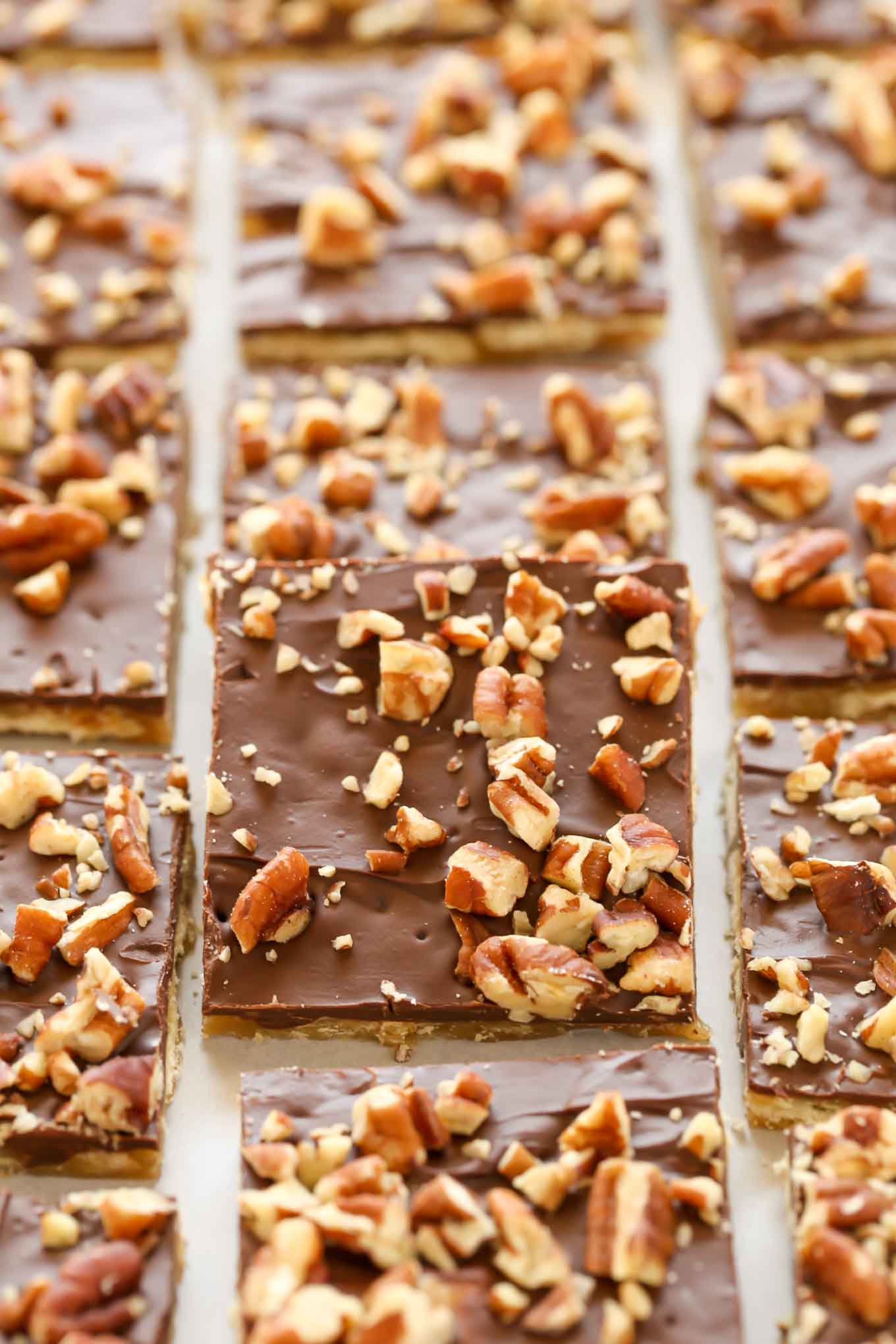 Saltine toffee may sound a little strange, but I promise it’s actually really delicious. The saltines are surrounded by a layer of toffee and topped with chocolate and pecans. And if you’re thinking this may be difficult to make, I can assure you it’s actually really easy.