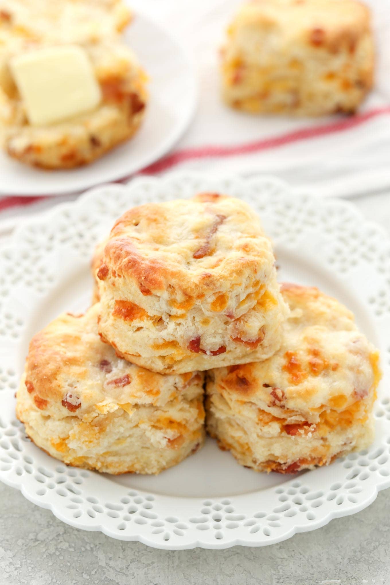 Soft, tall, buttery, and flaky buttermilk biscuits filled with cheddar cheese and bacon. These Bacon Cheddar Biscuits are perfect for breakfast or even dinner!