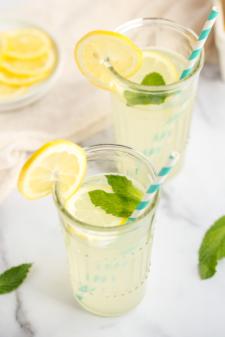 You can go ahead and serve the lemonade once you’ve mixed it up, but I like to refrigerate it for 1-2 hours or until it’s thoroughly chilled. I love to add some lemon slices and fresh mint to the pitcher for a little something extra, but it’s delicious without them too!