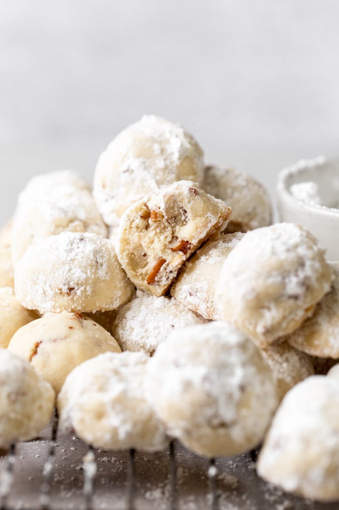 If you’ve never tried these cookies before, imagine a rich, buttery shortbread cookie that’s studded with chopped pecans and rolled in powdered sugar. And yes, they’re every bit as delicious as they sound.