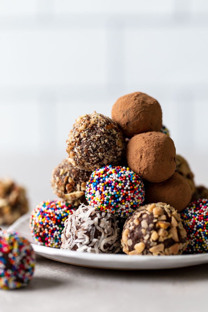 - Optional Coatings: Feel free to use whatever you have on hand here! I used unsweetened cocoa powder, shredded coconut, sprinkles, and chopped nuts. You may also dip the truffles in melted chocolate.